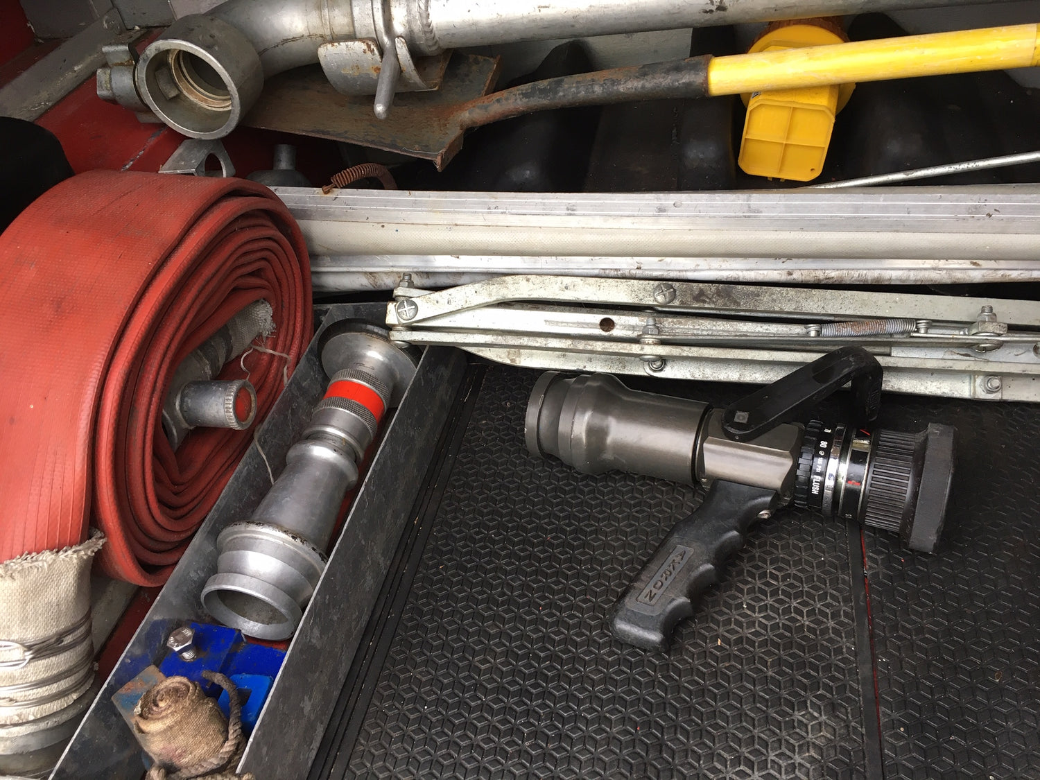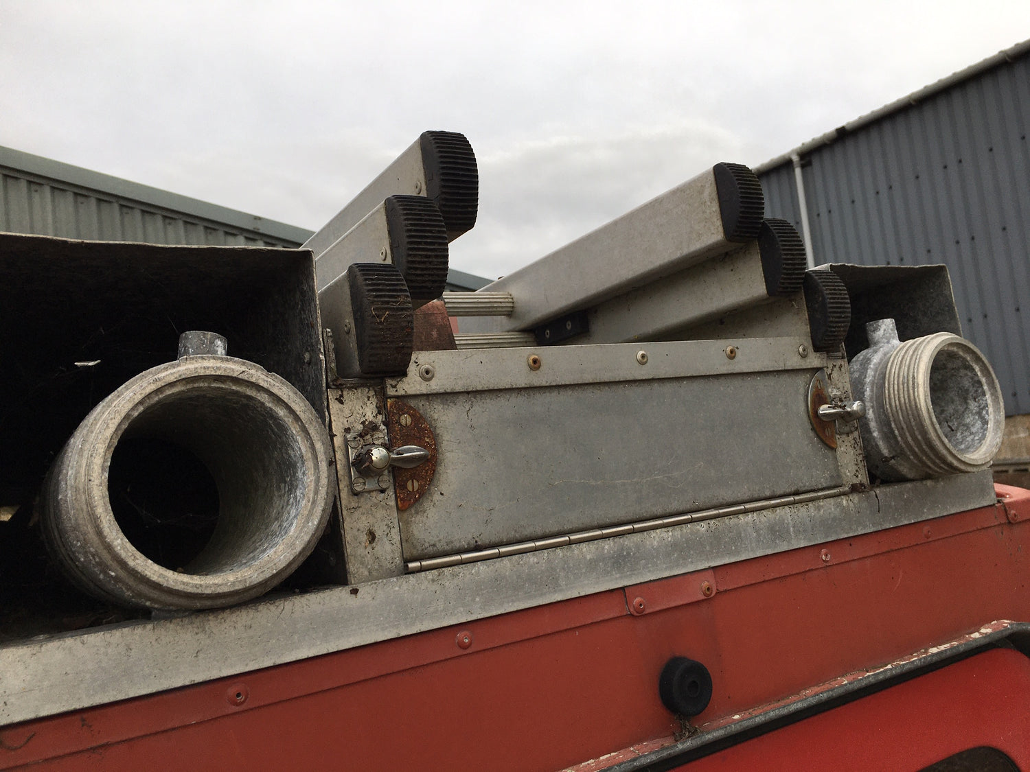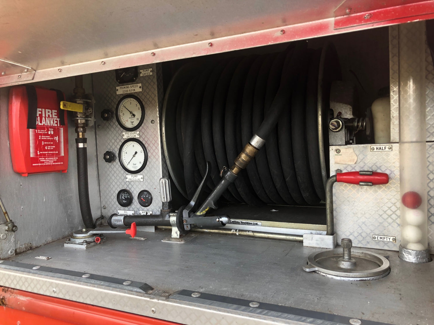This fire engine has a whole range of its fire fighting equipment included: Hose reel and extender hoses, ladder, beaters, ceiling hooks, elephants foot, wicker basket, collecting heads, 100 gallon on board tank.... It has fitted as original by Excalibur a mid mounted L4P water pump.
