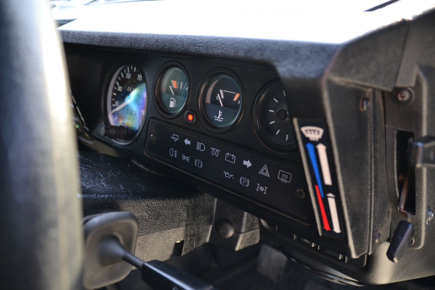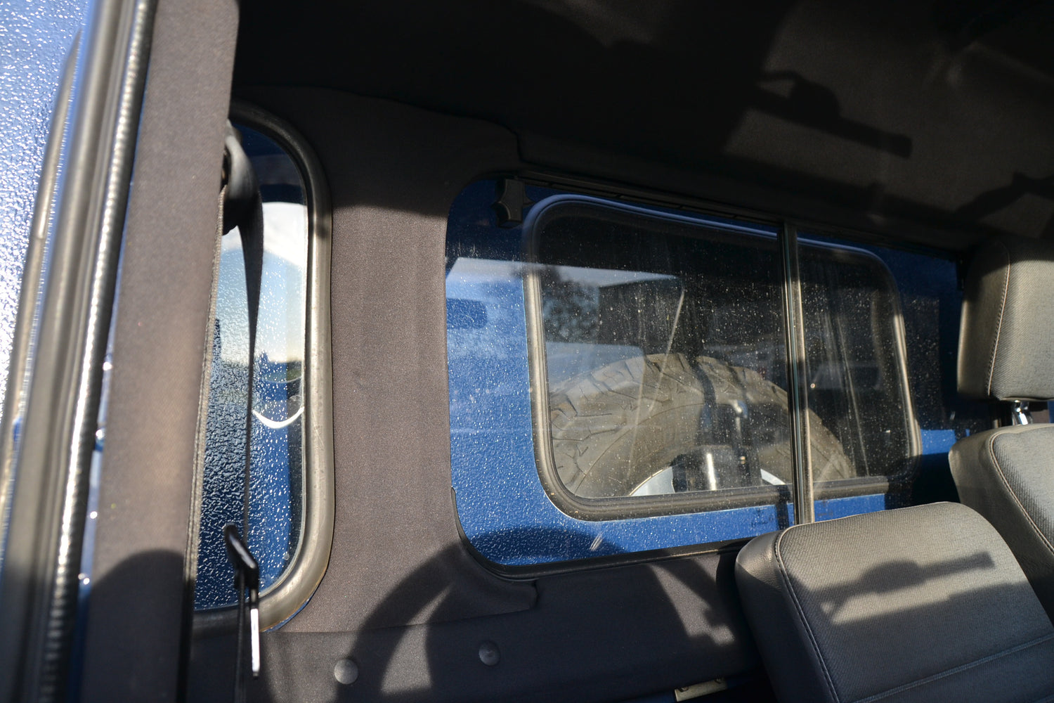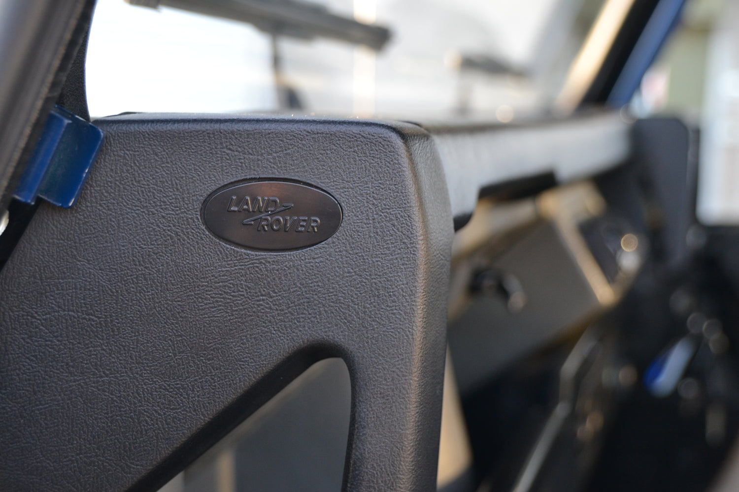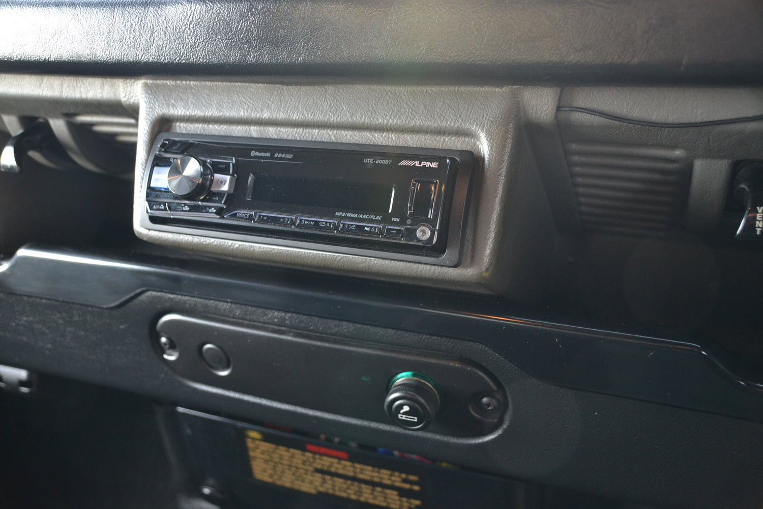 The interior of the cab has been kept neat and original with the exception of the headlining and cab trim. These have been professionally re-trimmed in a black fabric to match the interior if its owners RS4 at the time. The tunnel and seatbox trim was replaced with original Land Rover trim, neat and hard wearing and easily washed out. The original 3 front seats remain trimmed in Denim Twill Vinyl for that durable and hard wearing finish and keeps the interior easy to clean. They, like the rest of the interior, are in excellent condition. It has an Alpine BT head unit mounted in a factory fit housing playing through Harman Kardon speakers. OE Footwell mat set keep the factory look inside.